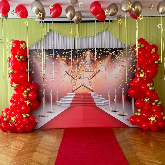 В работе используем всевозможные праздничные украшения. Это не только воздушные шарики, но и ткани, гобелены, бумагу, различные композиционные и прочие декоративные решения – все, что помогает нам оформить и привнести праздничности, уюта, а порой респектабельности и эмоций… По желанию клиента, это может быть насыщенная ситуация или воздушная атмосфера. Мы возьмем в расчет ваши предпочтения, чтобы Оформление зала шарами на выпускной стало фоном вашего торжества.